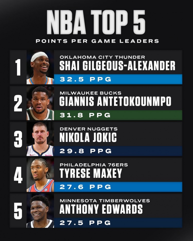 全明星前各项数据Top5:SGA得分王吹羊助攻王 约基奇四项排前五