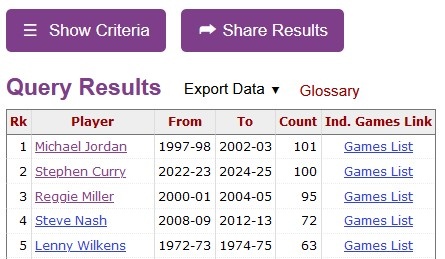 据统计,库里35岁之后已101次得分20+,他也追平乔丹,成为历史上达到这一成就最多的后卫。