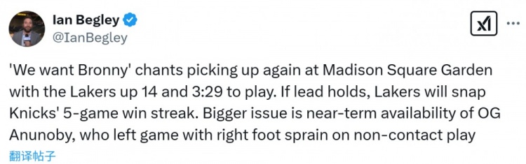 据尼克斯队记Ian Begley报道,比赛第四节末段,尼克斯主场球迷喊起了“我们要布朗尼”。
