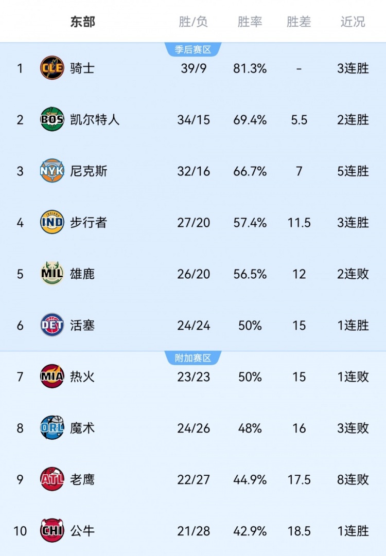 至此,步行者战绩来到了27胜20负,近13场11胜。他们排名也超过了雄鹿升至东部第四。