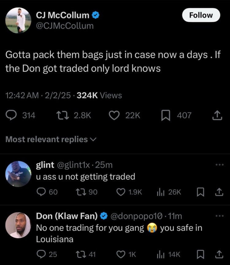 随后,CJ-麦科勒姆更推道:“我得先把行李打包好,连东契奇都被交易了,天知道会发生什么。”