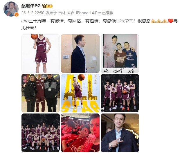 赵继伟晒照并写道:“cba三十周年,有激情,有回忆,有温情,有感慨!很荣幸!很感恩????????再见长春! ​​​”