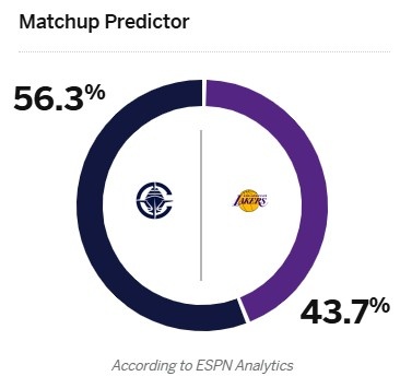 ESPN给出了本场比赛胜率预测,其中5连胜的湖人为43.7%,快船为56.3%。