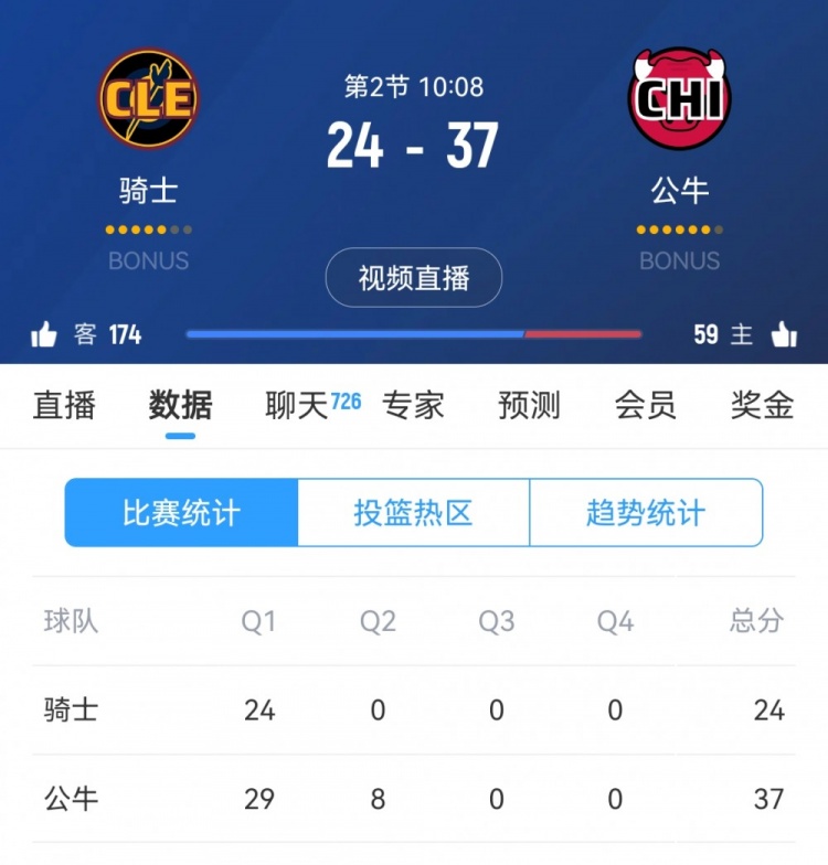 第二节,公牛持续发力,2分钟轰出8-0将优势扩大到13分,打停骑士。
