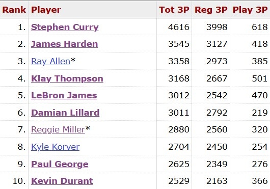 本场比赛过后,库里生涯(常规赛+季后赛)的三分命中数来到4618记,距离5000记还有382记。