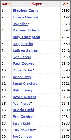 NBA历史三分榜:库里4000记断档第一 哈登3124第二 詹姆斯第七