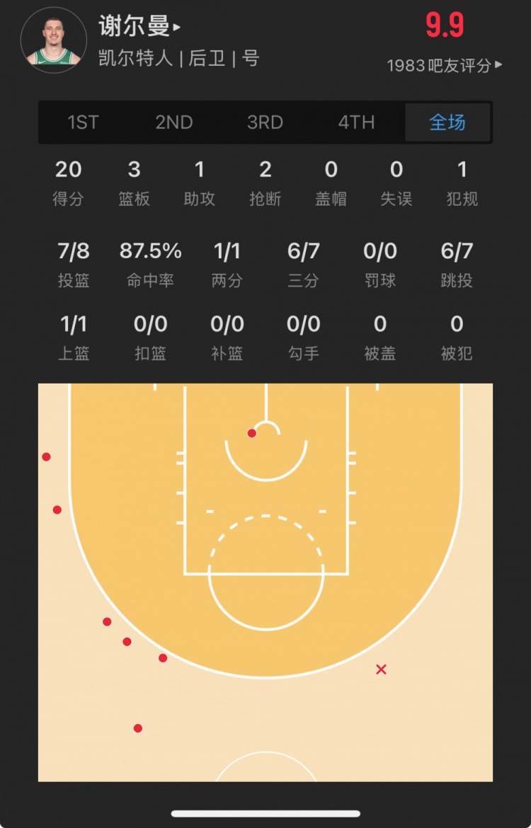 凯尔特人30号秀 贝勒-谢尔曼 登场15.9分钟