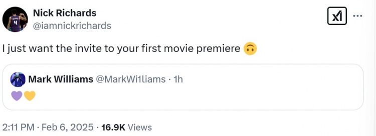 前队友尼克-理查兹评论道:“我只想要你在湖人首秀的邀请。”