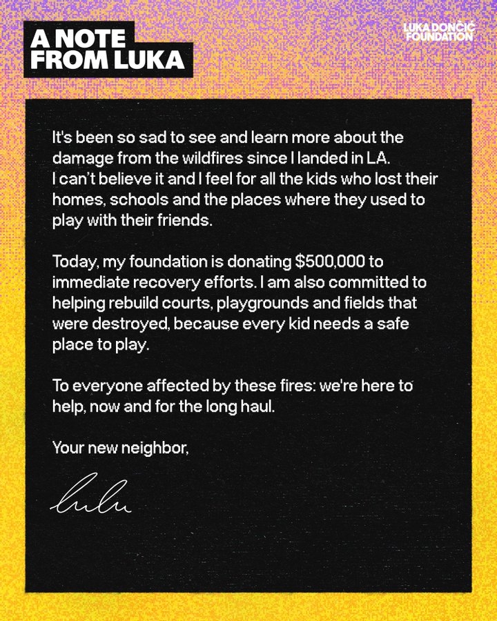 02月11日讯 东契奇宣布,他的基金会将捐款50万美元,用于帮助山火后的紧急重建工作,公告如下:
