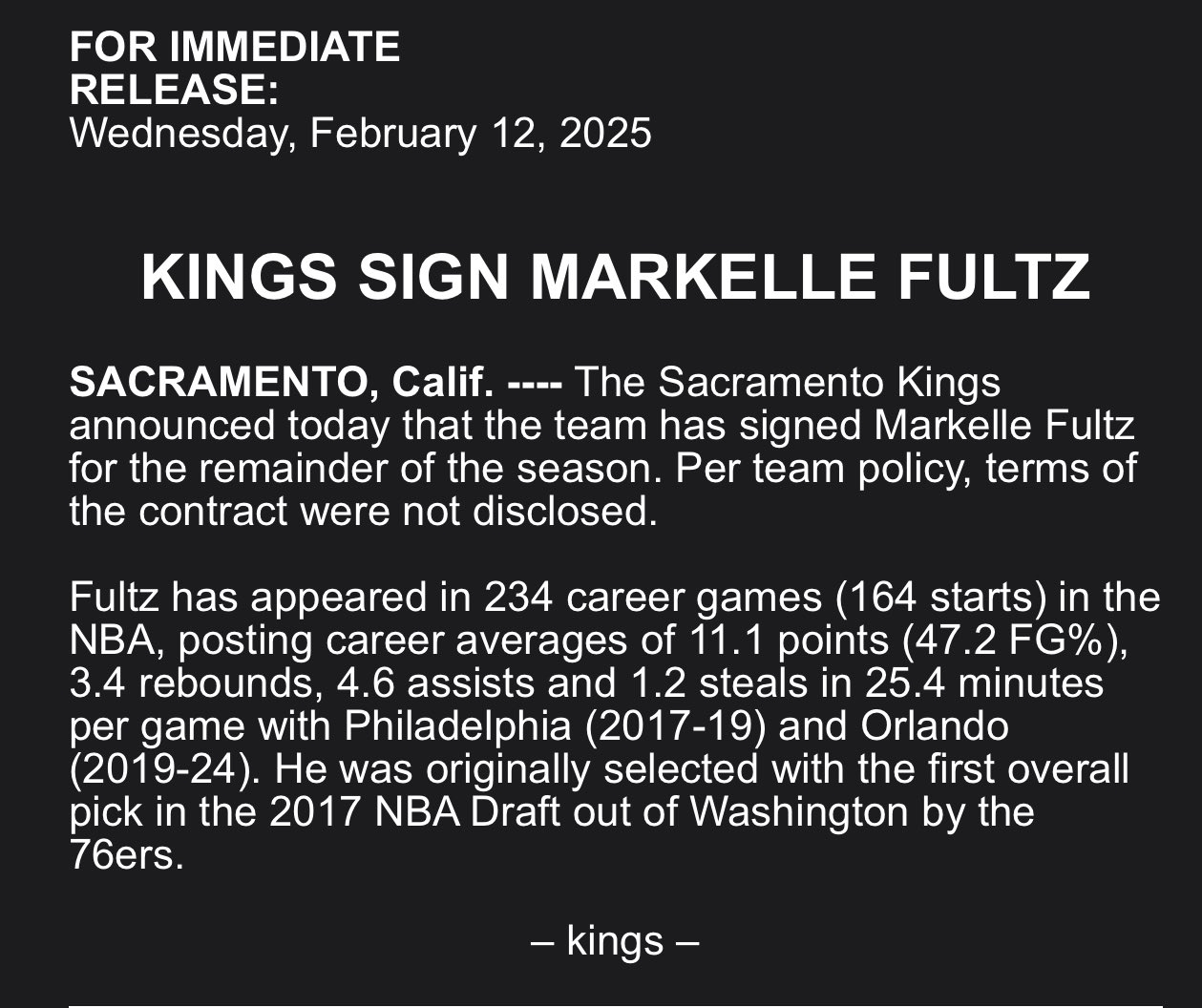 稍晚国王官宣了这一消息,并宣布和富尔茨签约至赛季结束。根据球队政策,合同细节未予公布。