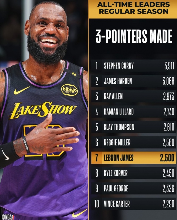 里程碑!詹姆斯生涯三分命中数突破2500 历史第七人 2月2日讯 NBA常规赛,湖人和尼克斯的比赛正在进行中。詹姆斯投进了一记三分球,他的生涯三分命中数突破2500大关,历史第七人。 2025/02/02