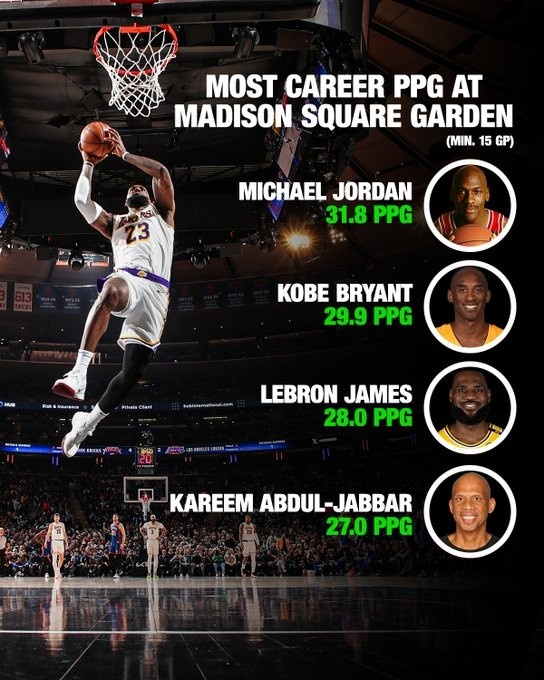 麦迪逊广场花园生涯得分:乔丹31.8分居首 科比2詹姆斯3贾巴尔4 备注:至少出战15场比赛 2025/02/02