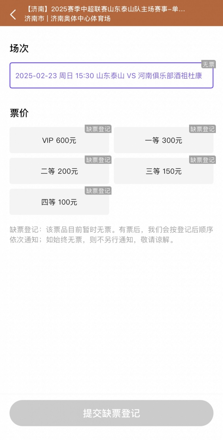 2月22日讯 2月23日下午,中超联赛首轮山东泰山将在主场对阵河南队。据购票平台显示,本场比赛球票已售罄。