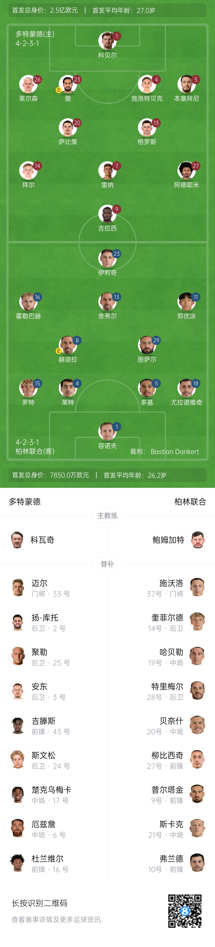多特替补:33-迈尔、2-扬库托、25-聚勒、3-安东、43-吉滕斯、24-斯文松、17-楚克乌梅卡、6-厄兹詹、16-杜兰维尔