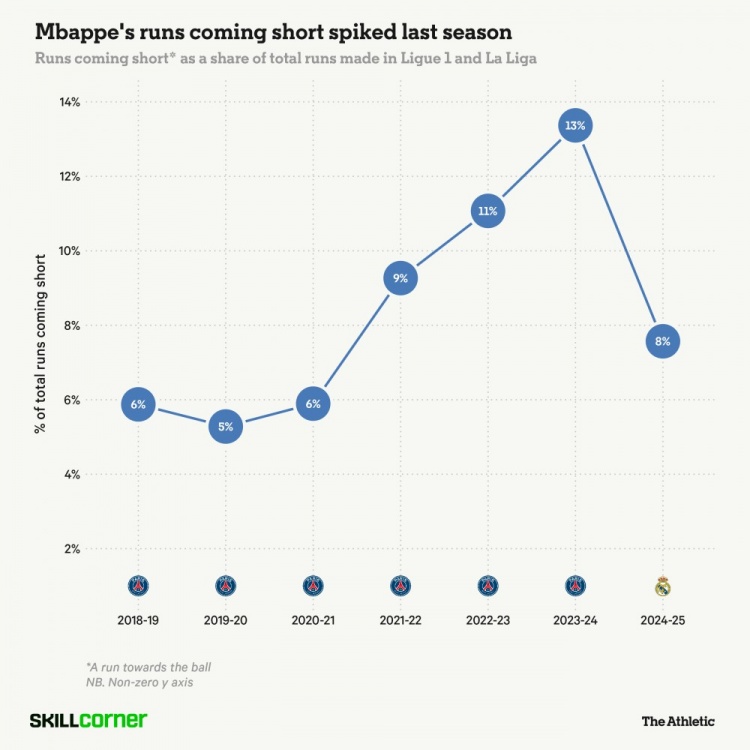姆巴佩向更传统的中锋演变,则是在他转会到皇马之后,进入了快车道。