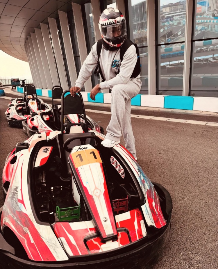 照片中,戴着头盔的小奥斯卡以各种pose与赛车合影,看上去心情非常不错。