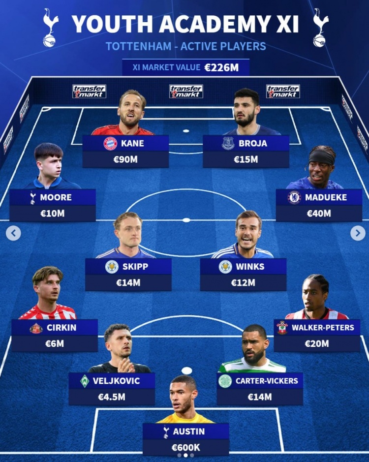 热刺青训当前身价最贵阵:总身价2.26亿欧元