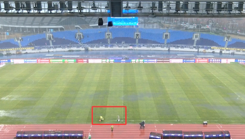 雨势太大!西海岸主场工作人员在场边刚画完线,线又被雨冲模糊了