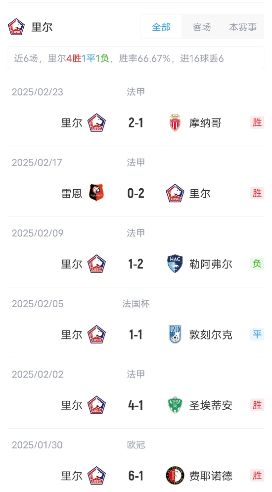 里尔首发:30-舍瓦利耶、4-亚历山德罗-里贝罗、5-古德蒙森、12-穆尼耶、18-迪亚凯特、20-巴克、6-本塔莱、17-穆卡、21-邦雅曼-安德烈、8-安赫尔-戈麦斯、24-阿克波姆