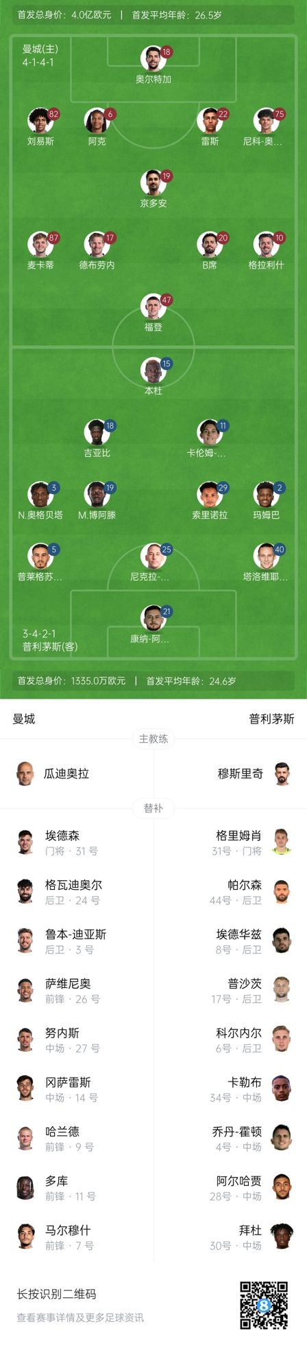 3月2日讯 足总杯1/8决赛,曼城主场迎战普利茅斯,赛前首发名单公布。