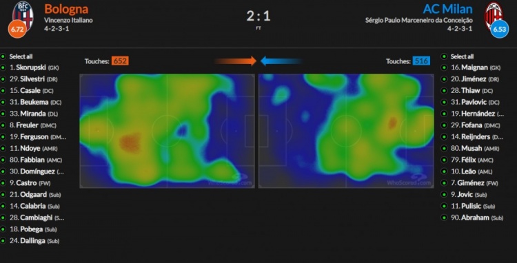输给博洛尼亚,米兰的热区表现:中场根本没有任何的控制力