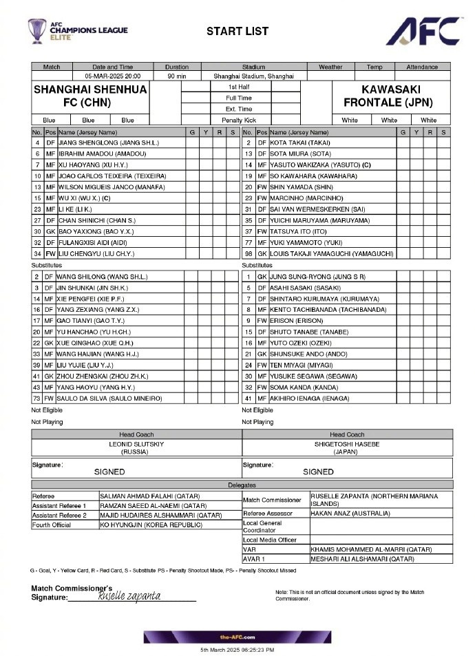 亚冠精英联赛1/8决赛首回合 上海申花vs川崎前锋首发名单 ​​​