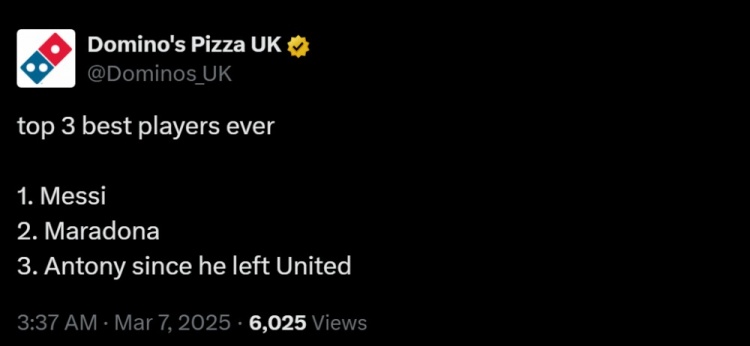 达美乐披萨吹圆神:历史前三是梅西、马拉多纳、离开曼联的安东尼