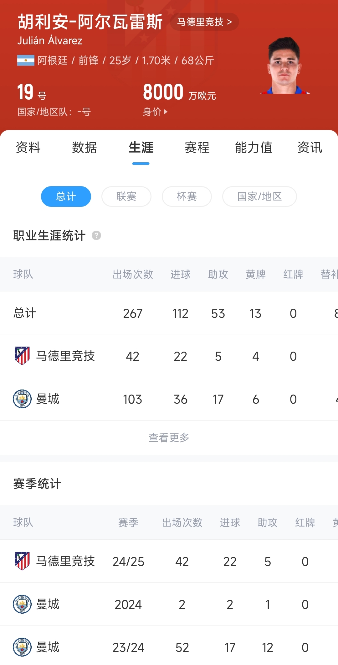 阿尔瓦雷斯本赛季数据:42场22球5助