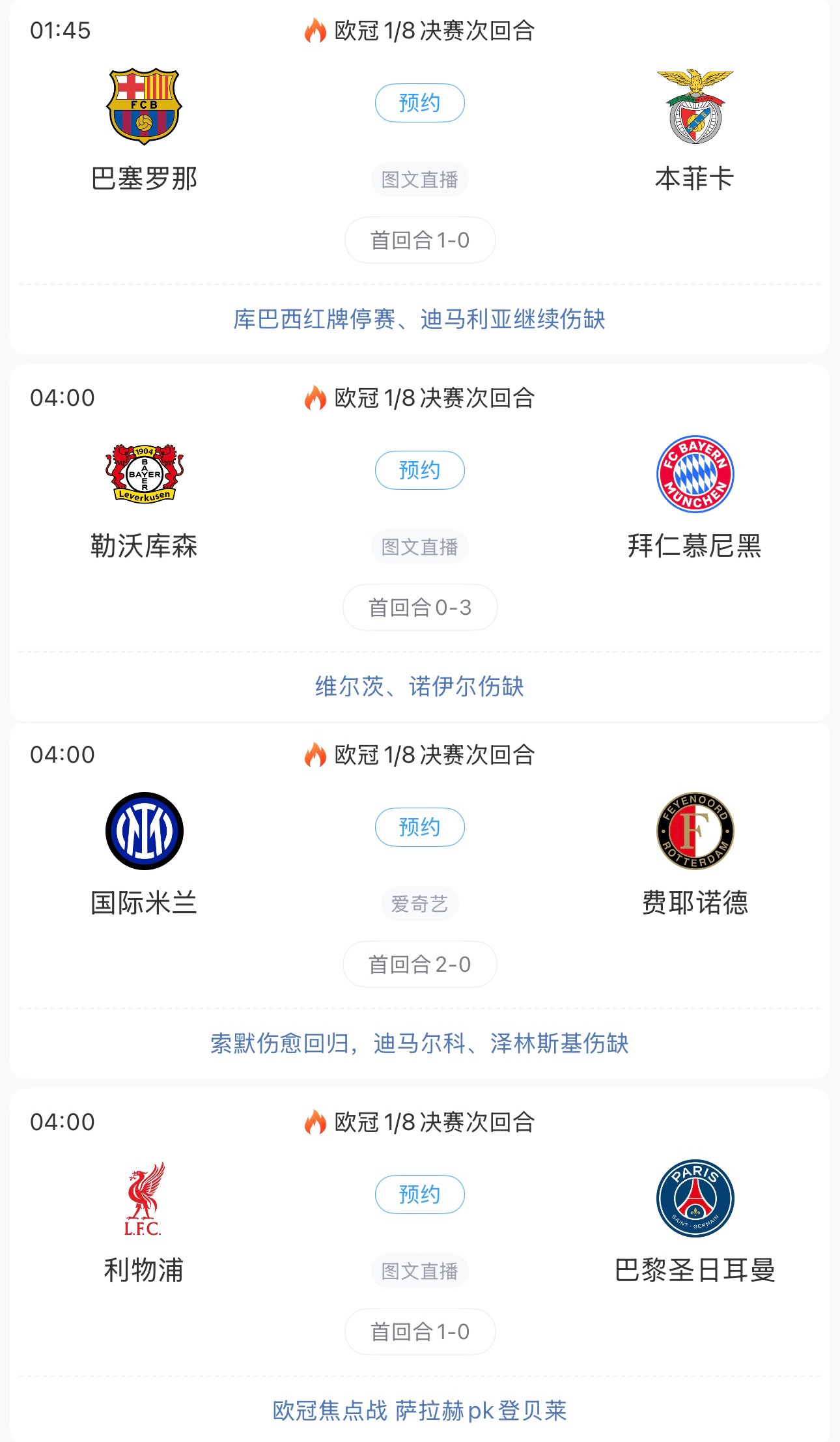 欧冠1/8决赛次回合⚔️萨拉赫登贝莱"金球之争" 巴萨拜仁国米出战