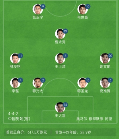 国足官方阵型442菱形中场:王上源单后腰,张玉宁、林良铭双前锋