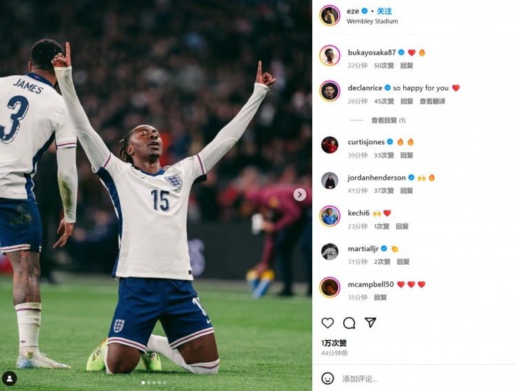 两人也都在赛后通过社媒晒出自己的比赛照,但并未附加文字内容。赖斯和霍尔等队友纷纷送上鼓励:“为你感到高兴”、“棒极了”…