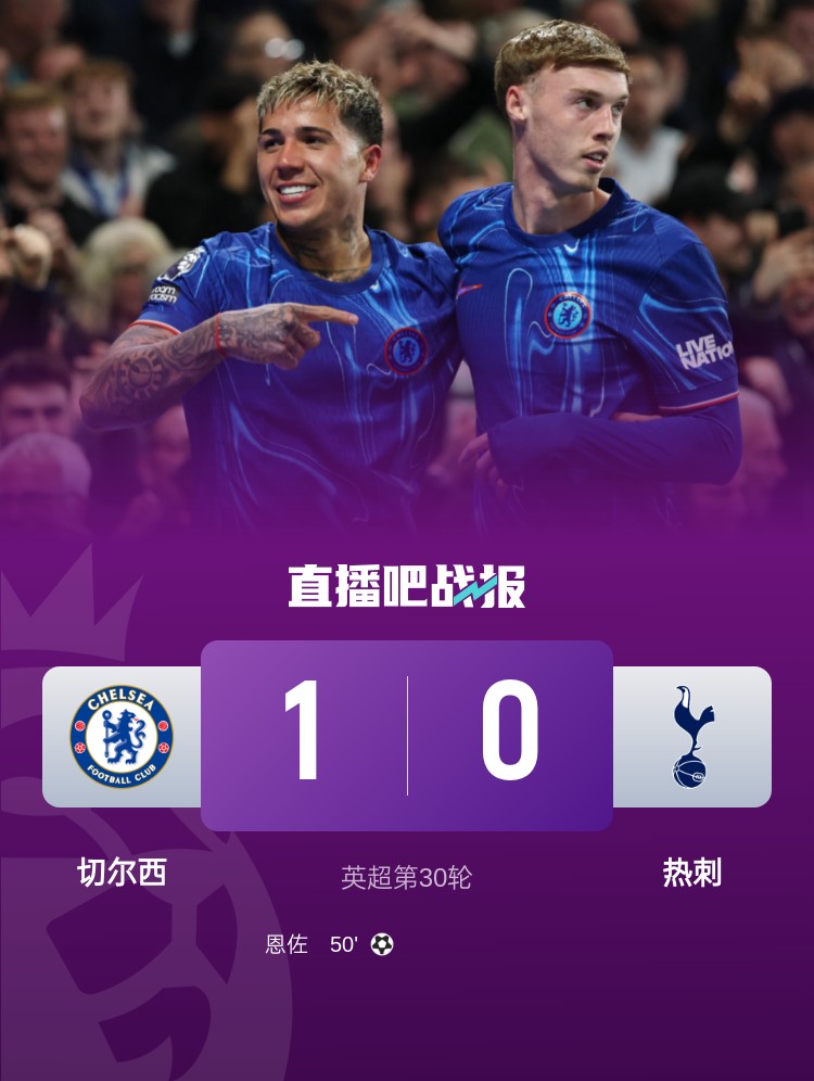 本轮英超焦点战,切尔西1-0击败热刺,恩佐打入全场唯一进球。