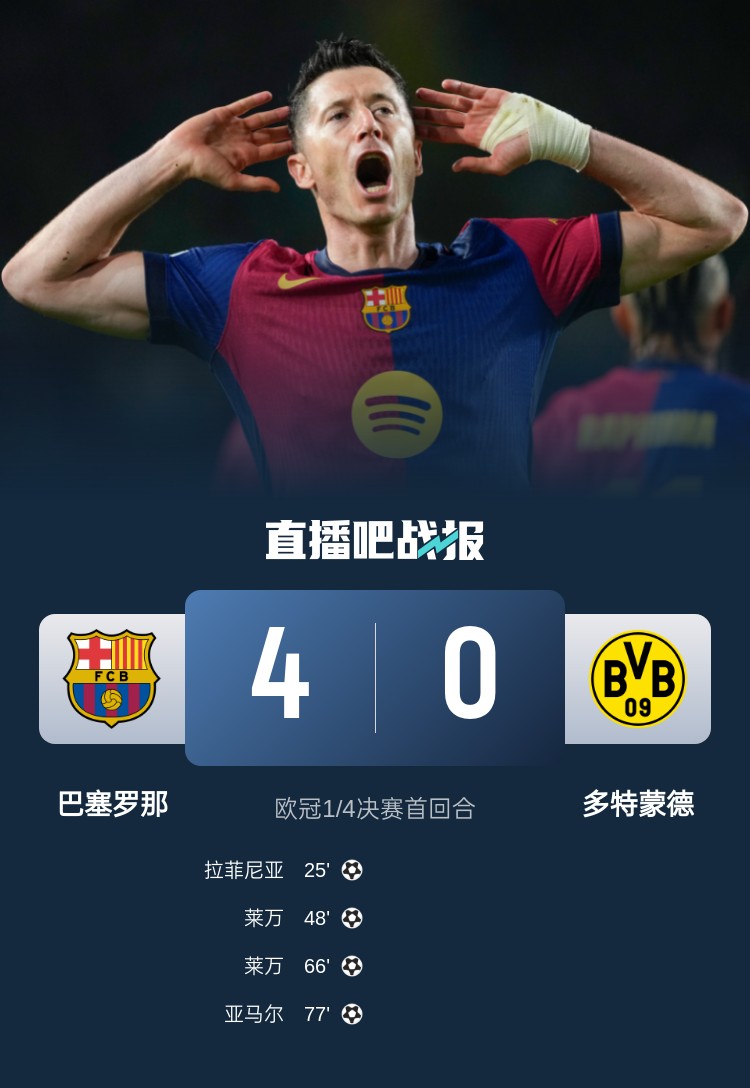 欧冠8强首回合,巴萨4-0大胜多特!莱万双响,亚马尔、拉菲尼亚破门!悬念已无了吗?