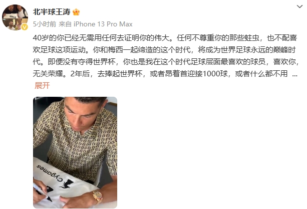 王涛写道:“40岁的你已经无需用任何去证明你的伟大。任何不尊重你的那些蛀虫,也不配喜欢足球这项运动。你和梅西一起缔造的这个时代,将成为世界足球永远的巅峰时代。即便没有夺得世界杯,你也是我在这个时代足球层面最喜欢的球员,喜欢你,无关荣耀。2年后,去捧起世界杯,或者昂着首迎接1000球,或者什么都不用争取,因为你足够伟大了。祝你生日快乐!”