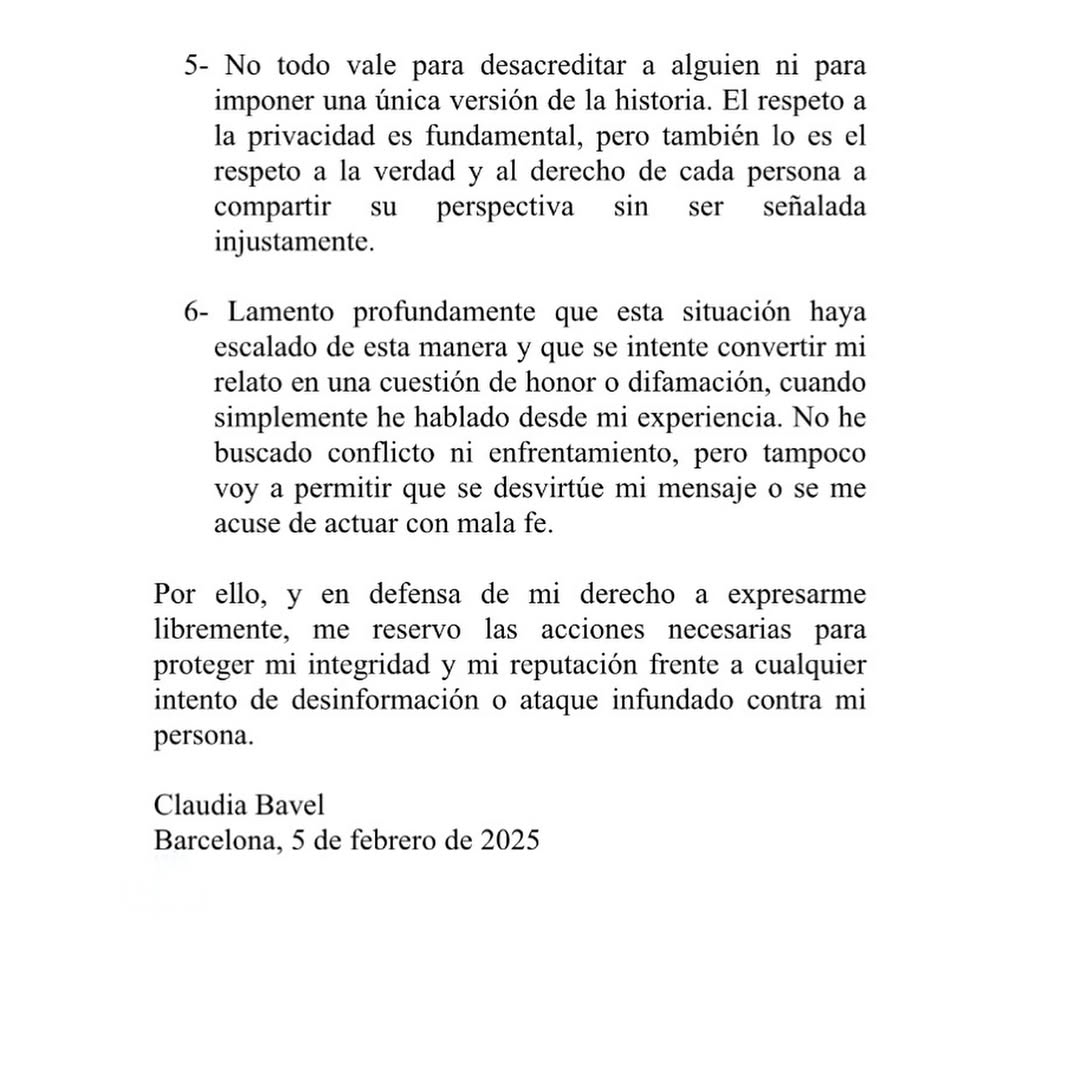 克劳迪娅-巴维尔随后也给出了自己的回应,她表示:“鉴于最近的事件和公开声明,我觉得有必要表达以下观点。和任何人一样,我有权分享我的经历,而不意味着侵犯他人的隐私。我一直对我的社区和关注我的人保持透明,从未试图用我的言辞伤害任何人。”