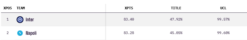 机构演算数据显示,国米本赛季意甲夺冠概率为47.9%,比目前排名榜首的那不勒斯高出近3个百分点,那不勒斯夺冠概率为45%,机构预测两队季末都是83个积分收官。