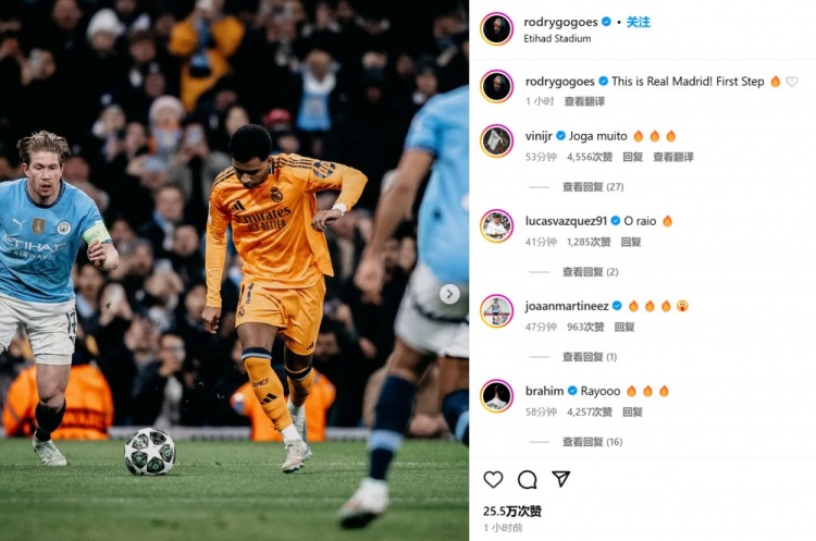 本场客串右后卫的巴尔韦德表示:“这就是真正的皇马!”而右边锋罗德里戈也配文道:“这就是皇马!迈出(晋级)第一步????????”
