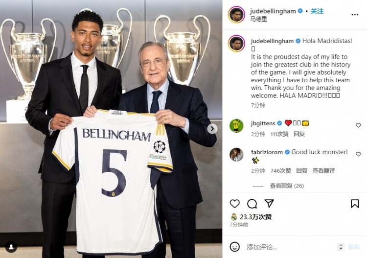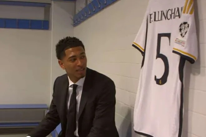 2023年夏天,贝林厄姆加盟皇马,穿上了偶像齐达内在皇马穿过的五号球衣。那一天,接受采访的贝林厄姆非常激动地说,齐达内是他的偶像,能够在皇马和偶像穿同样号码的球衣,他非常感动,希望自己能够成为皇马新五号。