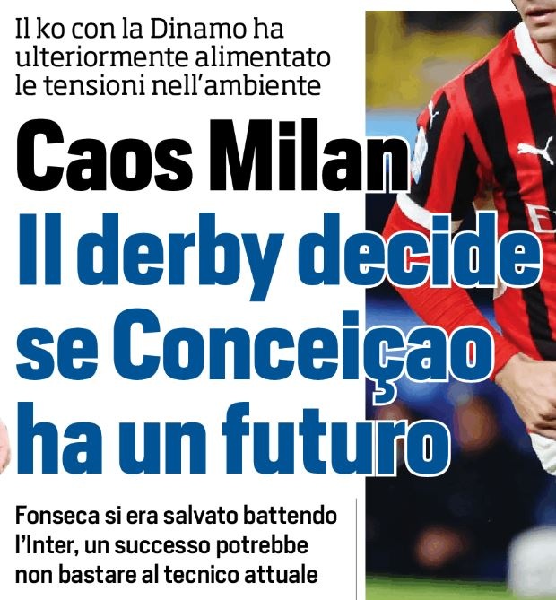 输给萨格勒布迪纳摩的比赛引爆了这场危机,现在米兰陷入了全面的混乱,每个人都开始受到评估。就跟往常一样,教练在这种情况下是最危险的人,虽然孔塞桑上任仅一个月就夺得了一座冠军奖杯,但他现在面临的风险最大。