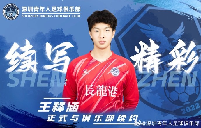 官方:深圳青年人续租23岁中场史堉铖,续约20岁门将王释涵