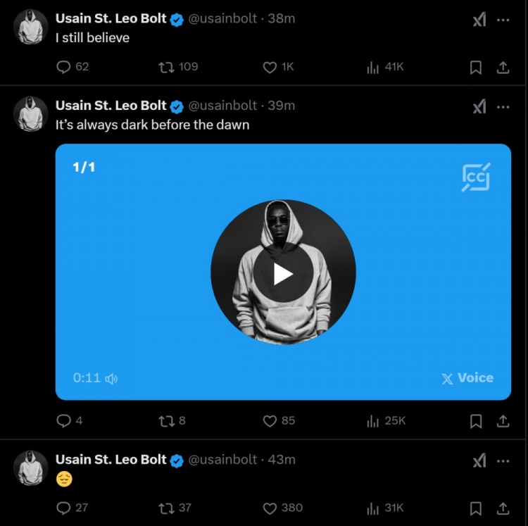 真红魔!曼联输球后博尔特发推:我仍然有信心,黎明前总是黑暗的 2月3日讯 本轮英超比赛中,曼联0-2不敌水晶宫。赛后,知名曼联球迷、短跑巨星博尔特更新动态,表示仍然对球队有信心。博尔特发了一个心情沮丧的表情包,然后写道:黎明前总是黑暗的,我仍然有信心。目前的英超 2025/02/03
