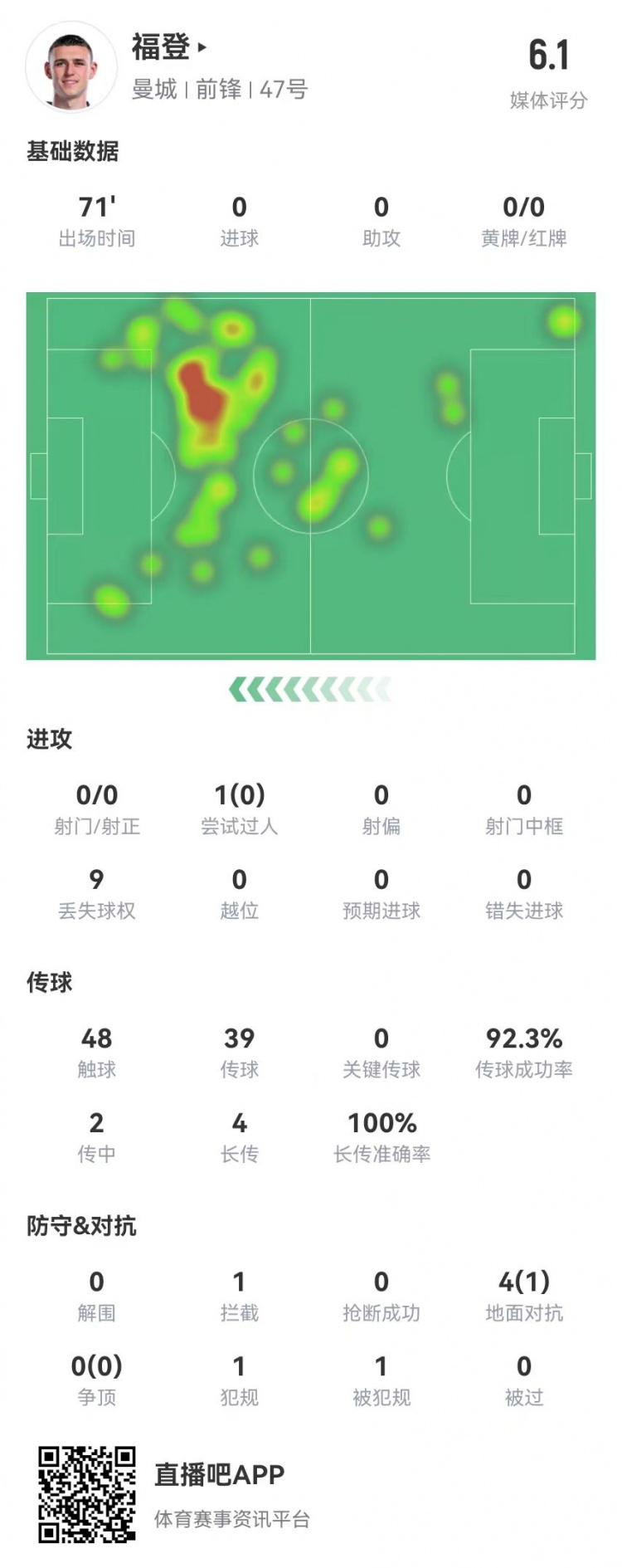 福登本场0射门0关键传球 4对抗1成功 1失误导致丢球 获评6.1分 2月3日讯 阿森纳在本轮英超主场对阵曼城,福登本场数据如下:首发出战71分钟48触球39传球、36成功,成功率92%2传中、0成功4长传、4成功1过人、0成功4对抗、1成功9丢失球权1犯规1造犯规1拦 2025/02/03