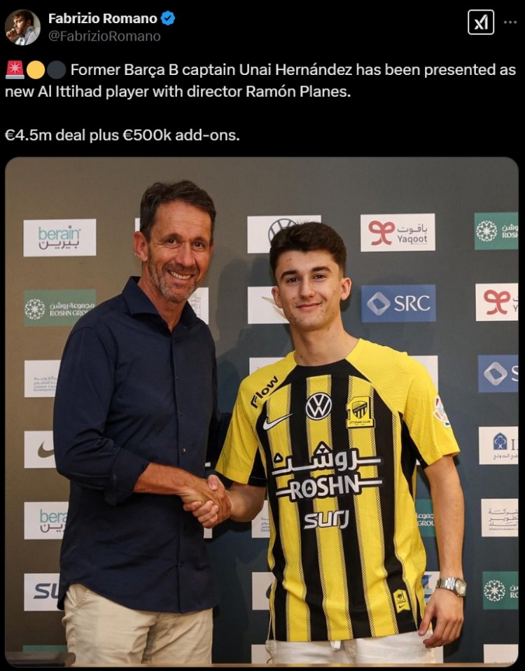罗马诺:前巴萨B队队长埃尔南德斯加盟吉达联合,转会费450万欧 2月3日讯 据知名转会专家罗马诺报道,前巴萨B队对长乌奈-埃尔南德斯加盟吉达联合。报道称吉达联合将会为乌奈-埃尔南德斯支付450万欧固定转会费,还有50万欧的浮动奖金。 2025/02/03