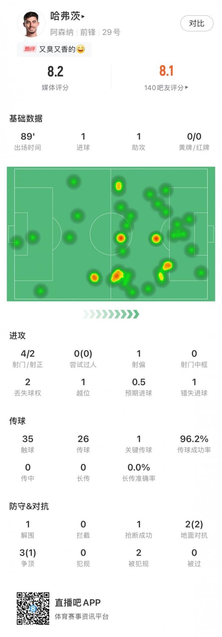 传射建功!哈弗茨全场数据:评分8.2,传球成功率达96.2% 2月3日讯 英超第24轮,阿森纳主场5-1大胜曼城,哈弗茨为枪手首发出战,贡献传射帮球队赢下强敌。哈弗茨全场数据如下:评分8.2出场时间89分钟,进球1次,助攻1次射门4次,射正2次丢失球权2次,越位 2025/02/03
