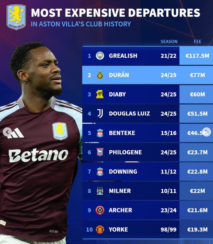 德转列维拉卖人榜:格拉利什1.175亿,杜兰、道格拉斯-路易斯在列 2月1日讯 利雅得胜利已经官宣签下维拉前锋杜兰,数据统计显示这也是维拉队史转会费第二高的转出。德转列维拉历史卖人榜:欧元1.格拉利什,→曼城,21-22赛季,1.175亿2.杜兰,→利雅得胜利,24- 2025/02/01