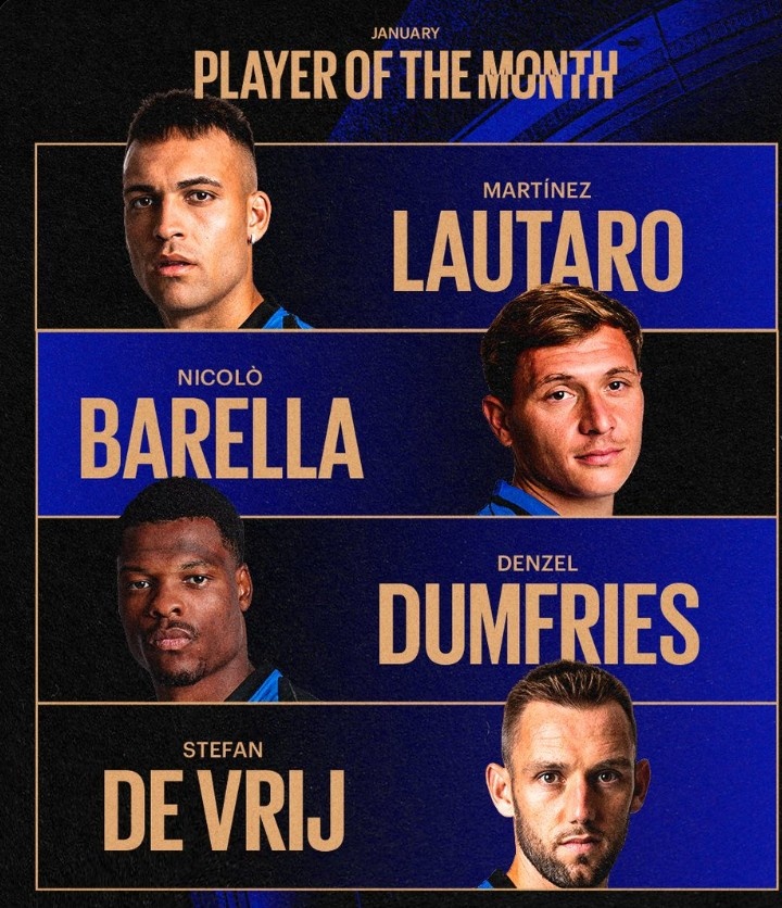 国米官方1月最佳球员候选:劳塔罗8场8球2助领衔,邓弗里斯在列 1月31日讯 国米官方公布了1月份队内最佳球员候选名单,具体情况如下:劳塔罗:8场8球2助巴雷拉:8场2助邓弗里斯:8场5球德弗里:8场1助 2025/01/31